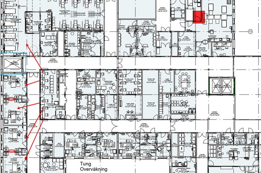Intensiv er lokalisert på plan 2 med operasjon, post operativ og overvåking. Akuttmottak og bildediagnostikk i plan 1 med akuttheis.
