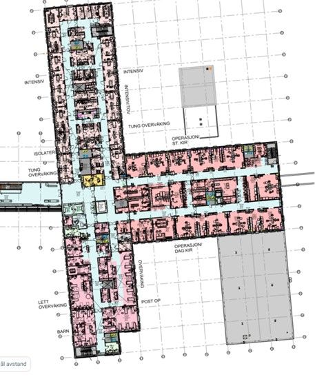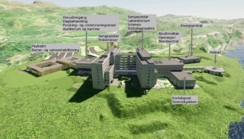 I nybygget på Hjelset er akuttmottak og bildediagnostikk på bakkeplan (plan 2), med operasjon, oppvåkning og intensiv en etasje over. Disse tre enhetene er lokalisert i hver sin fløy. Det er dobbeltkorridor med støtterom i midtkjernen.