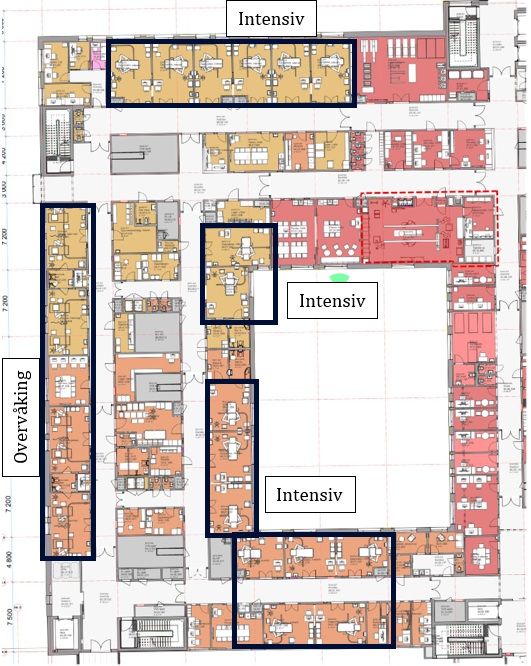 Nytt sykehus i Drammen åpnes i 2025. Intensivenheten er lokalisert i behandlingsbygget. Det bygges 16 intensivplasser. 2 av intensivplassene er luftsmitteisolat. Tegningen under viser intensivenheten ved Nye Drammen sykehus. Enheten er delt i to (farget gul og oransje), med 8 intensivplasser på hver i tillegg til 2 overvåkingsrom i hver enhet.