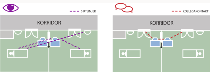 Det er skyvedør med stort glassfelt mellom intensivrommene. Arbeidsplassene er plassert rett ved skyvedøren