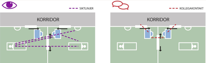 Pasientsengen er plassert med fotenden mot hverandre for å kunne se hodeenden til pasienten fra arbeidsplassen. Plassering av vask på vegg mot korridor er ikke til hinder for skyvedør. Det er kun feltet bak vasken som er tett vegg fra gulvet og opp, eller glass.