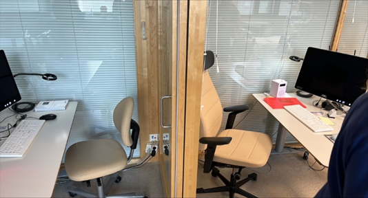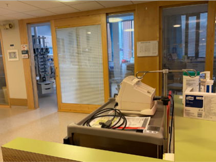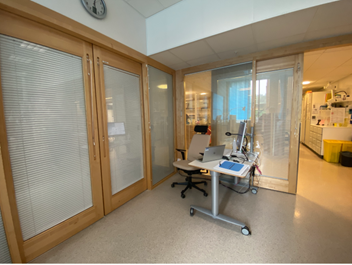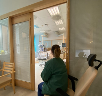 Plasseringen av arbeidsplassen på Intensivrommet gir god kontakt mellom kollegaer. Arbeidsplassen benyttes også til previsitt, da kan lege og sykepleier sammen diskutere og observere pasienten. Glass i vegg/dør inn til intensivrom gir god oversikt for personell som oppholder seg utenfor intensivrommet. Det er samtidig mulig å skjerme helt med persienner innebygget i glass.
