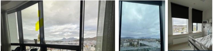Vindu og skyvedør mot korridor er vanligvis skjermet med integrerte persienner. Personalet har erfart at det har vært litt problemer med elektronikken som styrer persiennene. Teknikere har rapportert at det er vanskelig å «komme til» for å reparere persiennene. De mobile skjermveggene mellom sengeplassene hindrer pasienter og deres pårørende i å se pasienten i nabosengen, men skjermer ikke lyd. Dørene til sengerommene er ofte litt åpne, men dette medfører at taklys og lyd fra korridor kan forstyrre pasientene.
