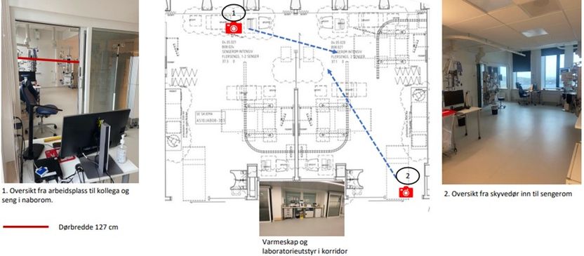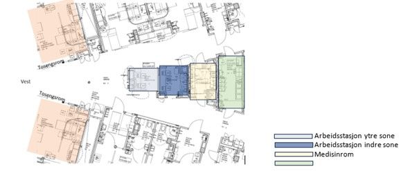 Figuren nedenfor viser arbeidsstasjonen som er plassert i fløy B i midtkjernen. Den har en åpen og lukket sone. I den åpne sonen er det plassert slaveskjermer. Det er utsyn fra den lukkede sonen av arbeidsstasjonen til ytre sone, til korridor og nærmeste sengerom. Den indre sonen har glassvegger og skyvedører i glass.