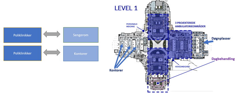 • I randsonen av poliklinikkene ligger det sengeavdeling med akuttsenger. Man antar at det ikke vil bli like stort behov for disse i fremtiden og de kan da gjøres om til poliklinikkrom.