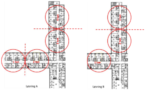 Plassering av spise- og oppholdsrom ble trukket fram som upraktisk både av ansatte og pasienter. Den lengste avstanden mellom opphold/spis til pasientrom er ca. 150 meter.