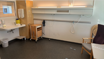 Det er vindu i vegg i korridor som gjør at man kan se inn på pasienten fra korridor, uten å forstyrre pasienten ved å gå inn i rommet. Mulighet for innsyn styres fra sengerommet med persienner.