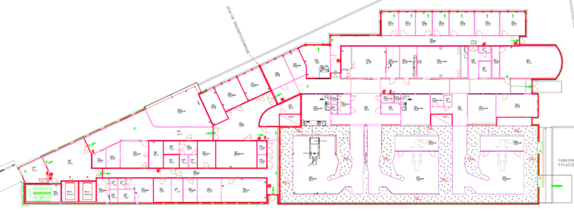 Tre strålebehandlingsrom med maze er plassert mot fasaden. Manøverrom er plassert like utenfor behandlingsrommene. Undersøkelsesrommene ligger i nærhet til behandlingsrommene.