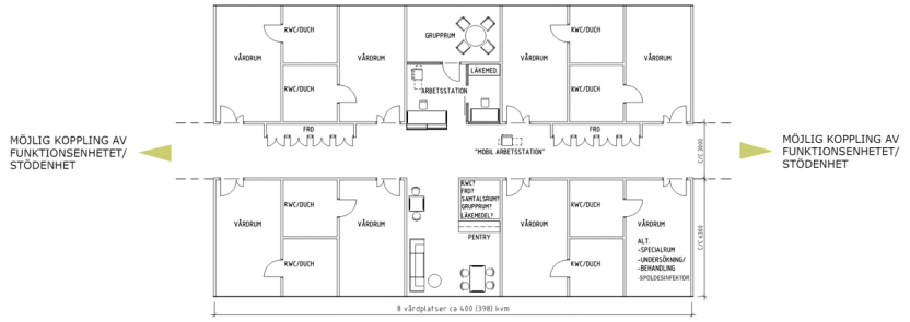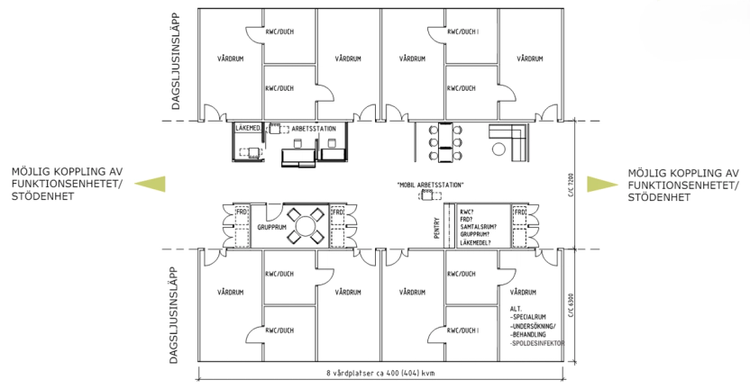 For å kunne plassere noen støtterom mot korridor, vist i figur over, er det behov for brede korridorer, noe som gjør bygningskroppen dypere. Figuren over viser at det mulig å passere med to senger, men ikke hele veien. Beslutning om korridorbredde har konsekvenser for brutto/netto-faktor.