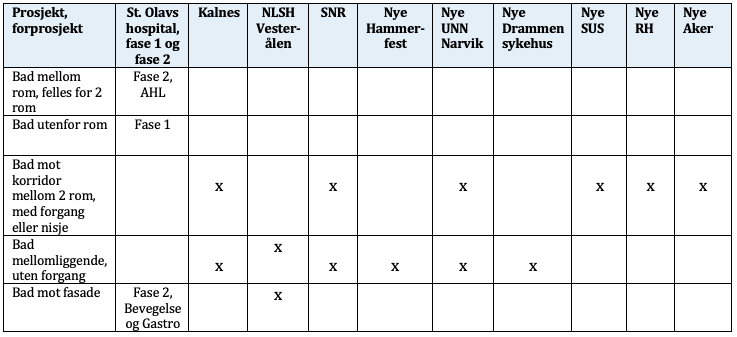 Figuren under viser hvordan plassering av bad kan variere i sykehus, også innenfor det samme sykehuset.