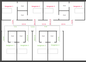 I figuren over er støtterom plassert annerledes, og løsningen gir større korridorbredde. Begge eksempler har like mange sengerom med bad.