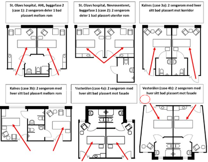 I alle eksemplene vist i figur 4.16, med unntak av Kalnes eksempel 3a (første figur fra høyre), er det god oversikt over inngangspartiet til sengerommet fra pasientens seng og god oversikt over sengerommet når man kommer inn på rommet.