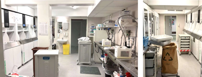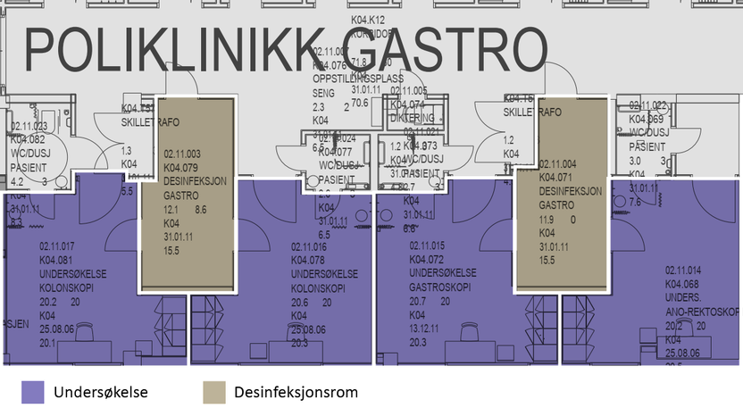 Desinfeksjonsrommene på gastrolab, Bærum sykehus er plassert i midtsonen i dobbeltkorridor med inngang fra begge sider. Det er eget rom til urent og eget rom til ren sone. Desinfeksjonsrommene er plassert midt i arealet for gastro endoskopilaboratoriene og det er korte avstander for personalet til de ulike rommene, se bilder nedenfor. De ansatte vurderer rommene som godt tilgjengelig og at det er en god løsning med to rom. Det er en del støy i arealet og de ansatte har hørselsvern tilgjengelig.