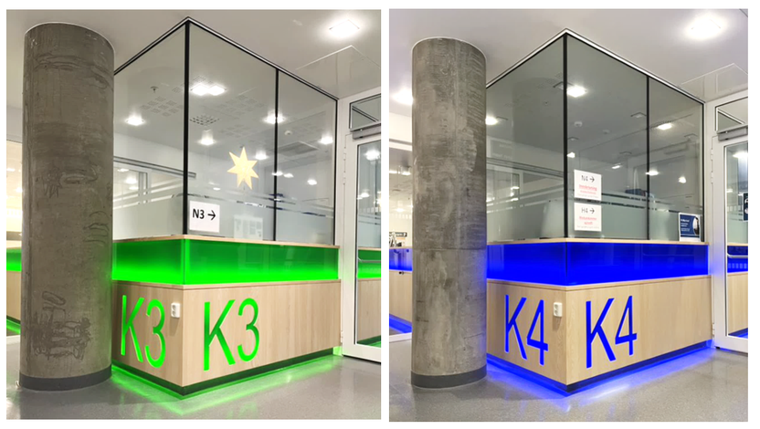 Bildene under viser bruk av fargekoder i poliklinikkområder på NLSH Bodø.