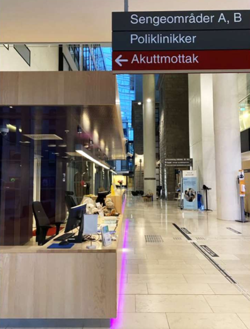 Sykehus er store komplekse bygg, med en ofte komplisert bygningsstruktur. Pasienter til poliklinikk- og dagområder står for den største andelen brukere inn i bygget. For å gi pasientene en trygg opplevelse bør veifinning og skilting bidra til, at pasientene enkelt kan orientere seg og finne frem sin avtale.