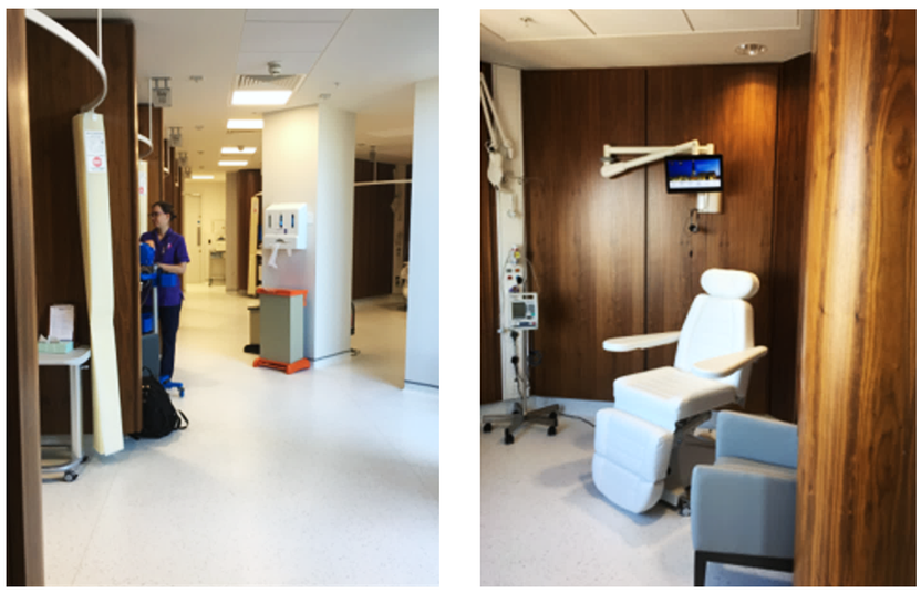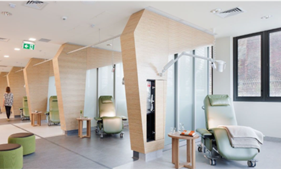 Dagområde for kjemoterapi, hvor pasientene sitter skjermet, Guys Hospital Cancer Center, LondonKilde: Sykehusbygg HF