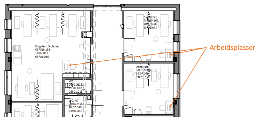 I dagområder bør det være tilstrekkelig med arbeidsplasser for de som jobber i arealene. Det må kartlegges om arbeidsplassen kan være åpen eller om ansatte trenger å jobbe bak lukkede dører. Det kan være en kombinasjon med åpen og lukket del, eventuelt med stillesone.