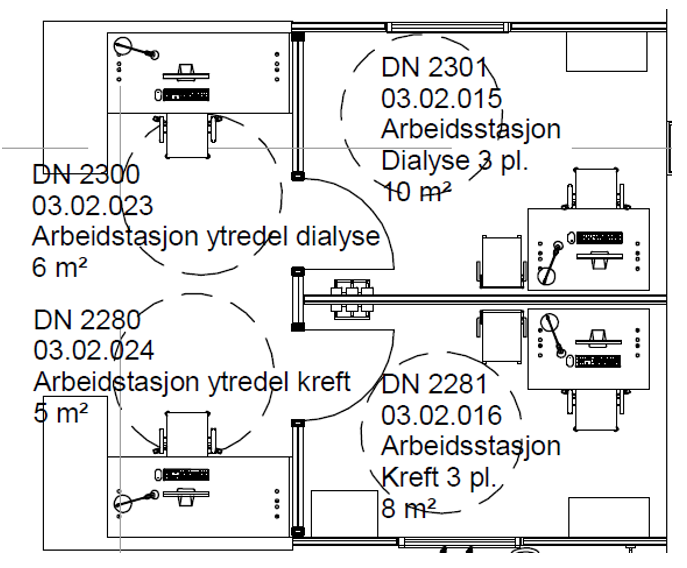 Sykehuset Østfold har egne områder for kjemoterapi og dialyse som er plassert i sengebygget i første etasje i poliklinikkområdet. Figuren nedenfor viser at hver dagplass (sal) innen kjemoterapi har en arbeidsplass som gir god oversikt over området.