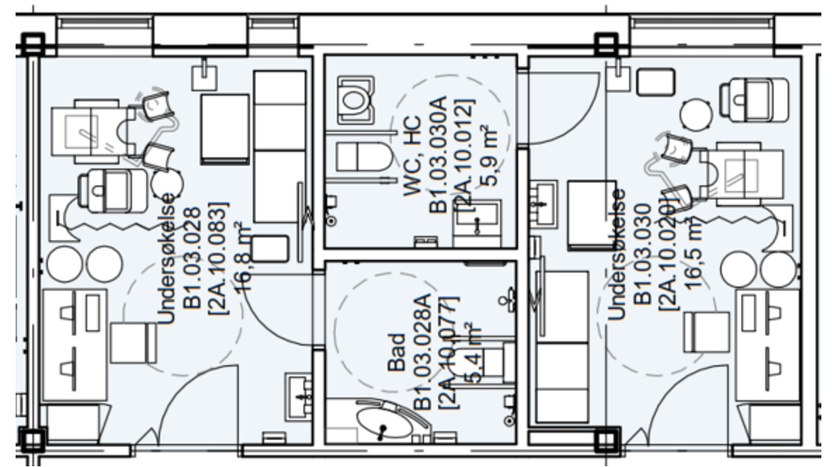 Figuren nedenfor viser tegning av UB-rom for bronkoskopi i NLSH Bodø. Rommet for bronkoskopi er 25,6 m2 med direkte tilgang til desinfeksjonsrom. I evalueringssamtaler ble det fortalt at ansatte i enheten opplever at rommet har en god størrelse.