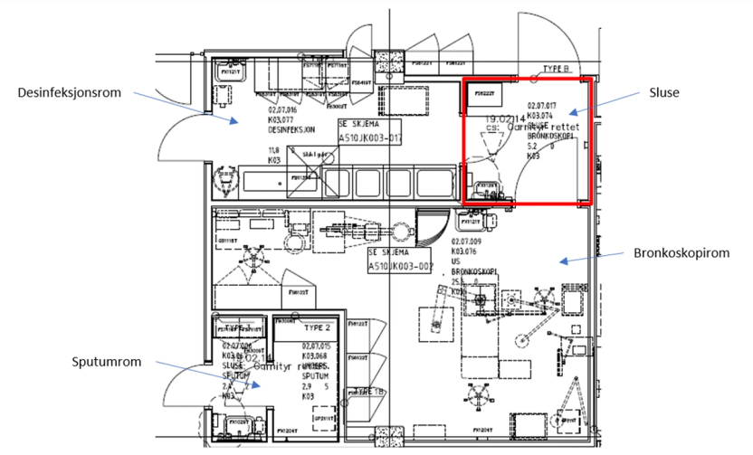 For å hindre at kontaminert luft forurenser omgivelsene, skal adgang til bronkoskopirommet gå igjennom en sluse. Både bronkoskopirommet og sluse skal bygges tette, ha undertrykk og tilkobles et separat luftbehandlingsaggregat.