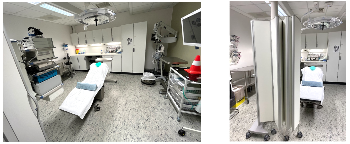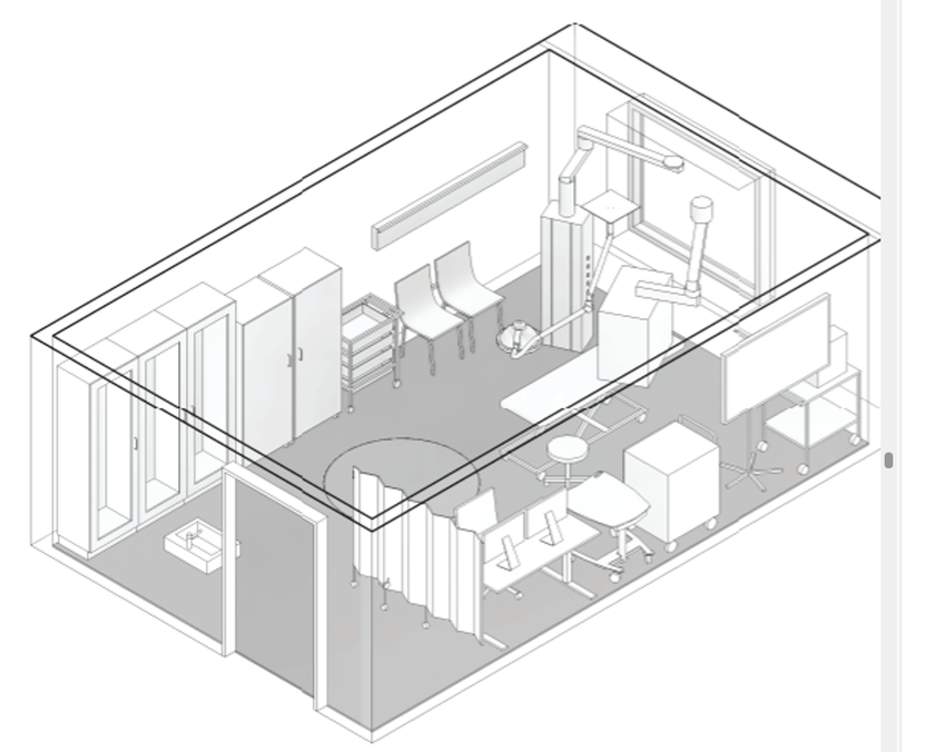 - Ergonomisk plassering av arbeidsplassene for helsepersonellet opp mot plassering av undersøkelsesbenk, skopracket, arbeidsflater, lagerplass m.m. Vær spesielt oppmerksom til plassering av svingarme til skjermer