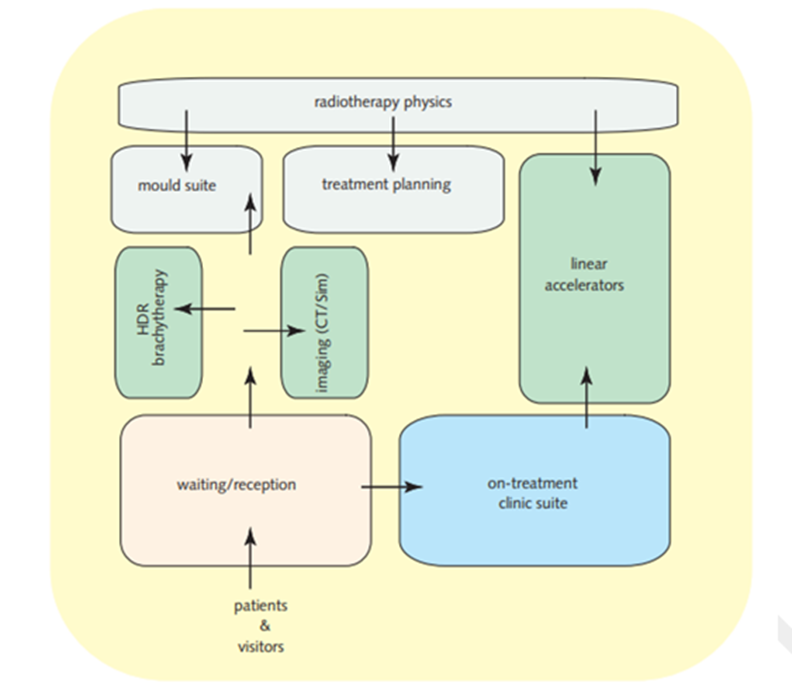 Arealer for stråleterapi har definerte områder eller soner, og sammenstillingen av de funksjonelle områdene bør være slik at behandlingsplanlegging og pasientbehandling er i nærheten av hverandre. Videre bør støttearealer plasseres slik at det er korte gangavstander for ansatte. Ventearealer og resepsjon bør være i nærheten av behandlingsrommene. I en engelsk studieHealth Building Note 02-01: Cancer treatment facilities. NHS ENglandhttps://www.england.nhs.uk/wp-content/uploads/2021/05/HBN_02-01_Final.pdf blir prinsippene for utforming av stråleenheter illustrert se figuren under.