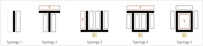 - Typologi 2: En rett korridor som Typologi 1, men har også arealer i enden av korridoren på tvers (T-struktur).