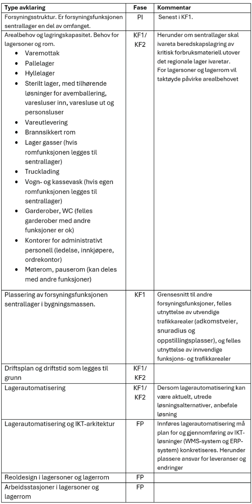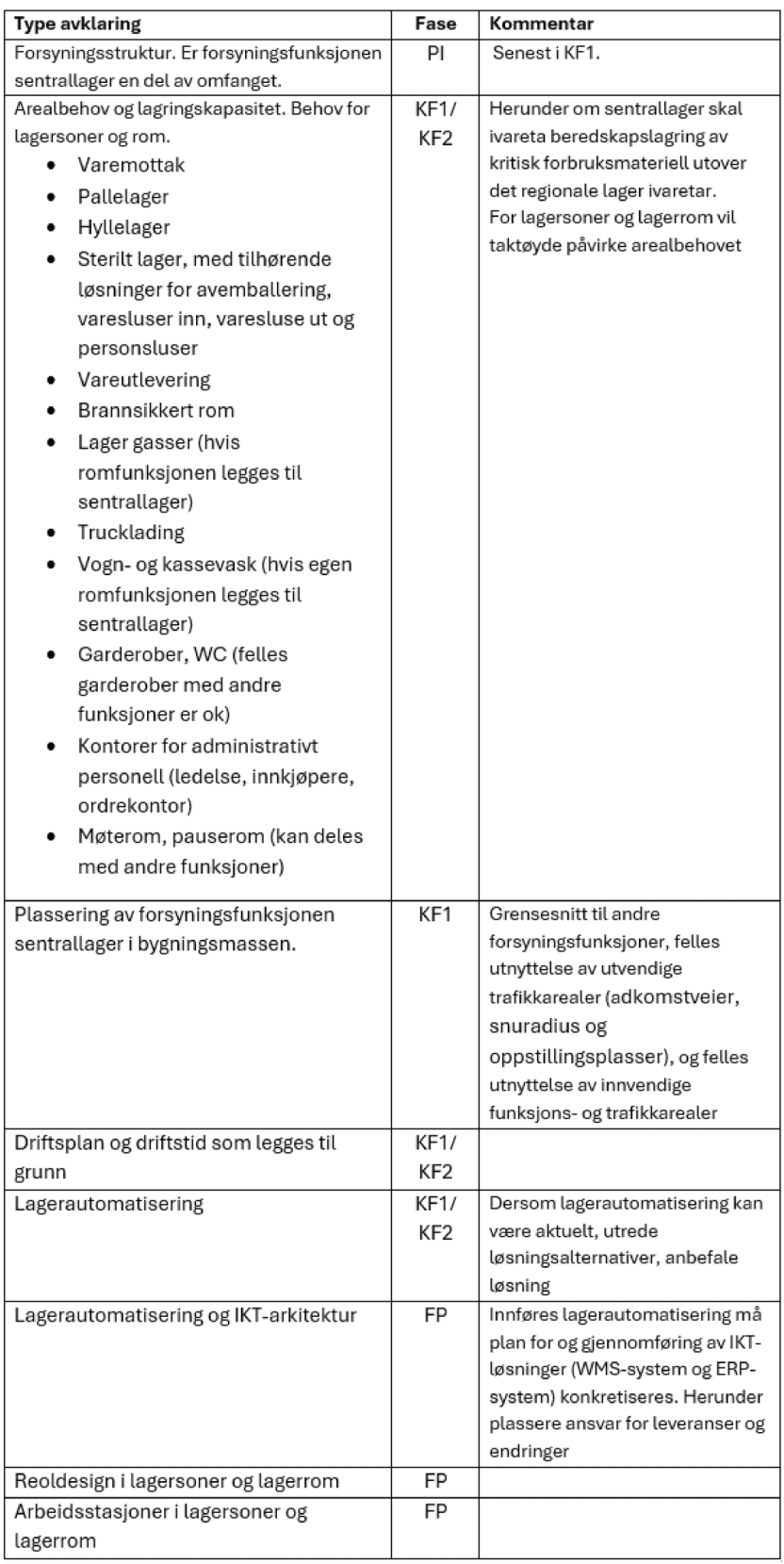 Her gis en oppsummering av viktige avklaring som anbefales ved planlegging av sentrallager, og som først og fremst har påvirkning på arealbehovet og konseptuelle løsningsvalg, og i hvilken fase avklaringene bør gjøres. Listen er nødvendigvis ikke uttømmende. Forklaring på faser: