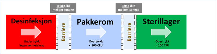 Sterilsentralen deles inn i tre soner med et tydelig skille mellom sonene urent, rent og sterilt – se figur nedenfor.