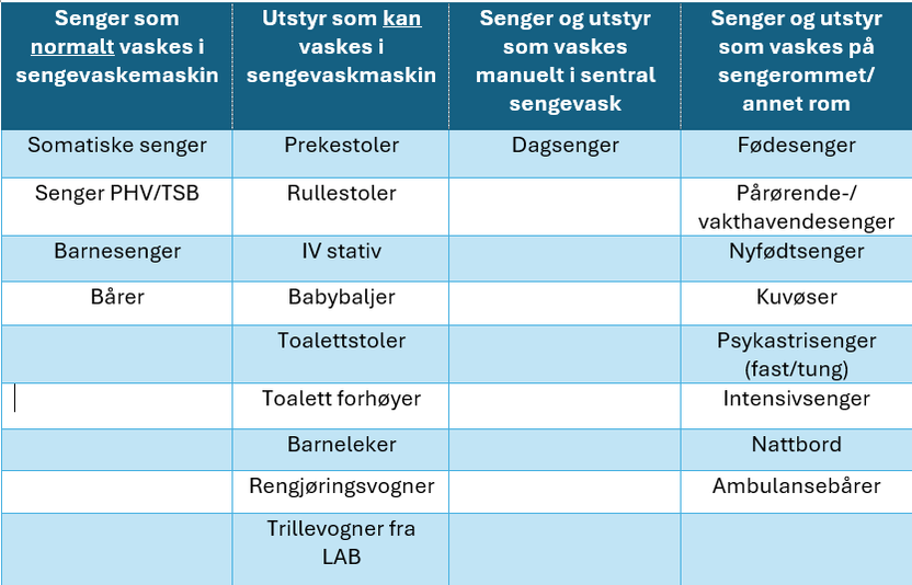 I kunnskapsgrunnlaget beskriver vi forsyningsfunksjonen sengevasksentral med delfunksjoner, kapasiteter, rom/arealer og flyt av urene og rene senger – se tabell nedenfor. For hvilke typer senger og utstyr som kan vaskes eller ikke vaskes i en sengevasksentral er det en oversikt i tabellen (eksempel fra Mjøssykehuset, konseptfaserapport.