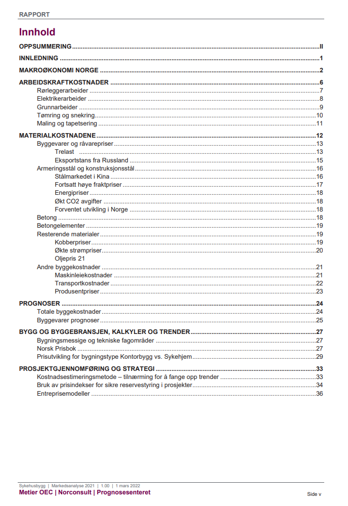 I bildet under vises innholdsfortegnelse for rapporten "Markedsanalyse for prisutvikling av byggekostnader"