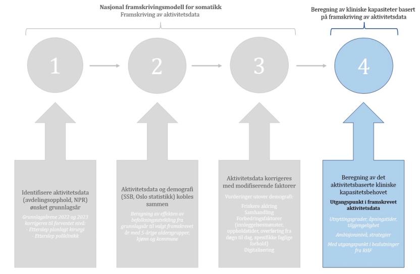 Beregning av kliniske kapasiteter er her basert på den framskrevne aktiviteten presentert tidligere. Det betyr igjen at de beregnede kapasitetene ikke dekker det samlede kapasitetsbehovet ved et sykehus. Når de ulike framskrevne aktivitetene er estimert gjennom framskrivingsmodellen, er det mulig å fastsette framtidig kapasitetsbehov basert på ulike grader av utnytting av kapasitetene. Dette er illustrert i figuren nedenfor i trinn 4. De ulike utnyttingsgradene av kapasiteter beskrives nærmere nedenfor.