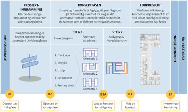 Oppbygging av Byggveileder følger VEILEDER FOR TIDLIGFASEN I SYKEHUSBYGGPROSJEKTER, som omfatter de tre planfasene; prosjektinnramming, konseptfase og forprosjektfase. Det legges til grunn at tiltak/prosjektet er forankret i helseforetakets utviklingsplan.12