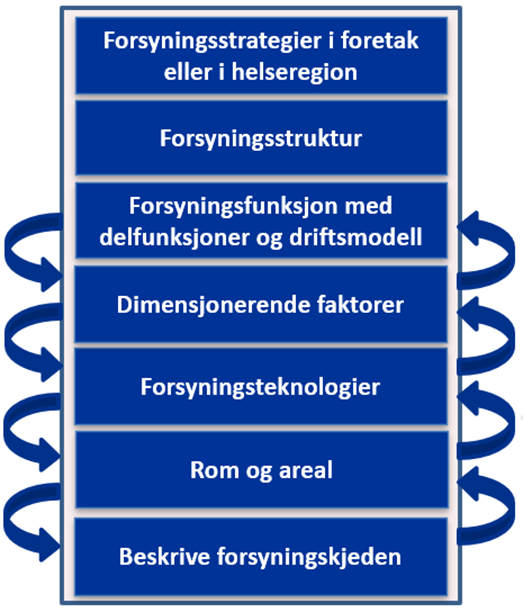 - Valg av forsyningsstruktur for de ulike forsyningsfunksjonene, inkludert avklaring om forsyningsfunksjonen er lokalisert i sykehuset eller ved en ekstern lokasjon.