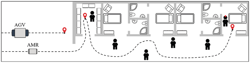 AMR/AGV transportene anbefales å foregå så adskilt fra pasientvirksomhet som mulig, men det finnes også erfaringer fra andre sykehus hvor AMR beveger seg i avdelinger med pasienter. Integrasjon med tekniske installasjoner som heis, dørmiljø, brannalarmsystem og trådløst nettverk er nødvendig for AGV-/AMR-ens kjøretrasé.