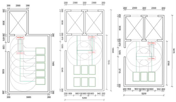 Eksempler på mulige romkonfigurasjoner for AGV-stasjoner i tilknytning til heisområdeKilde: Oslo Universitetssykehus HF, Helse Sør-Øst RHF og Team Aker