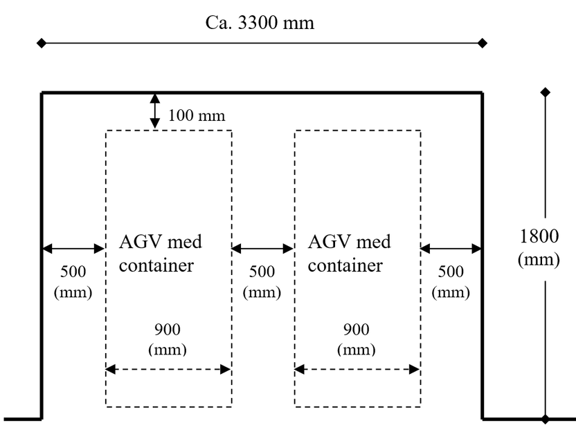 Eksempel på arealbehov for AGV hente-/leveringsstasjoner med plassering i tilknytning til korridor i et funksjonsområde. Korridorarealet benyttes til manøvrering.Kilde: Swisslog, St. Olavs hospital HF