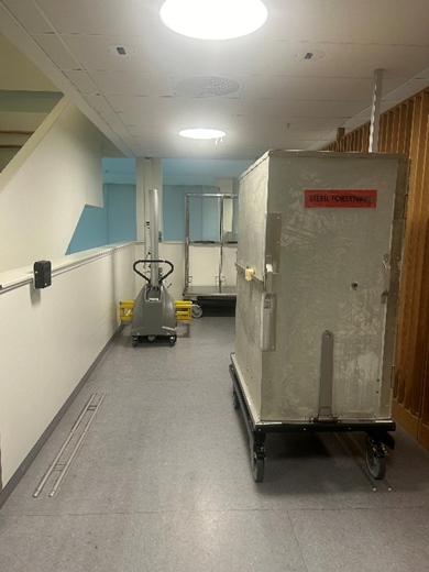 Den andre løsningen er flere hente- leveringsstasjoner ved siden av hverandre, og da plassert i enden av varemottaket i tilknytning til kulvert. St. Olavs hospital har en slik løsning, se figuren nedenfor.