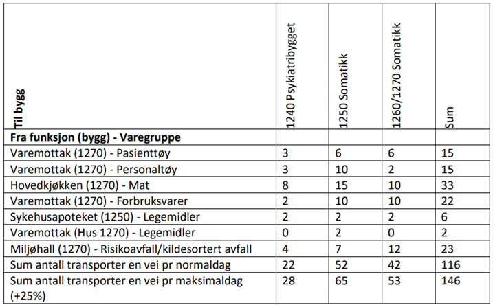 Eksempel transportmatrise vogntransportKilde: Sykehusbygg HF