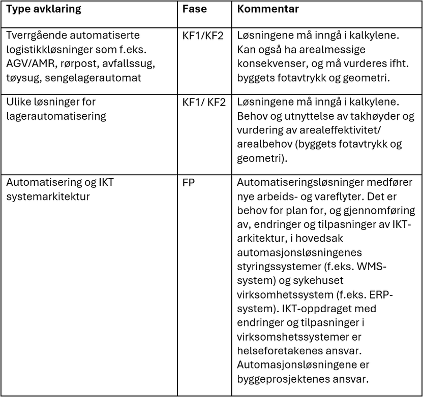 Her gis en overordnet oversikt av viktige avklaring som anbefales ved planlegging av forsyningsteknologier, og som først og fremst har påvirkning på arealbehovet, konseptuelle løsningsvalg og investeringskostnader. Det er også en anbefaling på i hvilken fase avklaringene bør gjøres. Listen er nødvendigvis ikke uttømmende.
