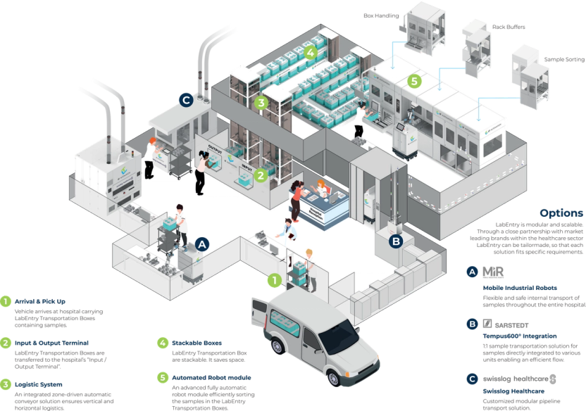 Et automatisert prøvemottak kan benyttes for mottak, sortering, kontroll og transport av lab-prøver til automatiseringslinjen på laboratoriet. En slik løsning har vært i drift i flere år i Aalborg og er installert i Malmø 2024. De prøvene som ikke kan transporteres med enkeltrørsystem sorteres ut og transporteres til laboratoriet med AMR hvor prøvene lastes av og sendes direkte til analysestasjon.