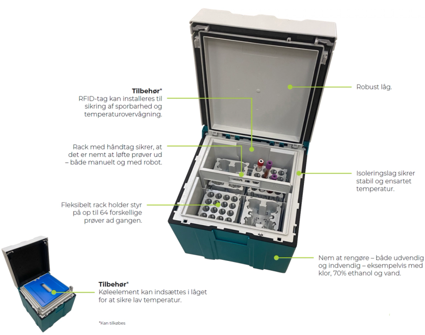Som en komplementær del av den tekniske løsningen for mottak av lab-prøver er en modulær transportcontainer som skal ivareta automatisert håndtering i prøvemottaket samt sikre kvaliteten av prøvematerialet under transport med bl.a. sanntidsinformasjon om lokalisering, temperatur-overvåking mv.