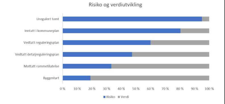 Det bør gjennomføres en kost-/nyttevurdering av iverksetting av eventuelle tiltak, før eiendommen selges (så som omregulering, bruksendring eller mulighetsstudie). Alternativt kan potensialet synliggjøres gjennom markedsføringen og innarbeides i salgsprospektet. Det er viktig å starte prosessen med å vurdere utviklingssalg så tidlig som mulig. I figuren under vises noen sammenhenger mellom risiko og verdiutvikling på overordnede tema.